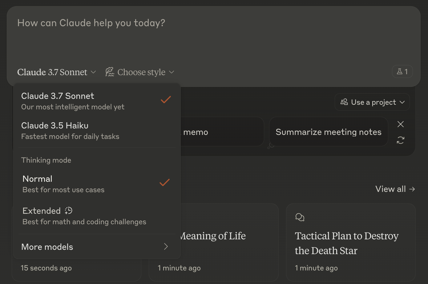 This streamlined model approach reflects Anthropic's broader philosophy of prioritizing user experience. In fact, Anthropic has consistently demonstrated a commitment to product experience that extends well beyond their model selection strategy. Claude was the first to provide "projects" allowing you to silo work and special instructions for particular areas of focus. For instance, I have a writing project set up with prompts for the type of feedback I'm looking for, tips on my writing style for when it makes recommendations, as well as notes on my target audience. None of that is necessary if I'm looking for a smoothie recipe or trying to strategize on how to bring down the death star. They launched artifacts providing a persistent anchor for document updates in a chat as well as allowing you to see the outputs of web pages or simple applications in the Claude web app. Their head of product comes from Instagram rather than a research lab. The science is no doubt as important but they seem to care about the experience. As someone that has to interact with it, I appreciate it.