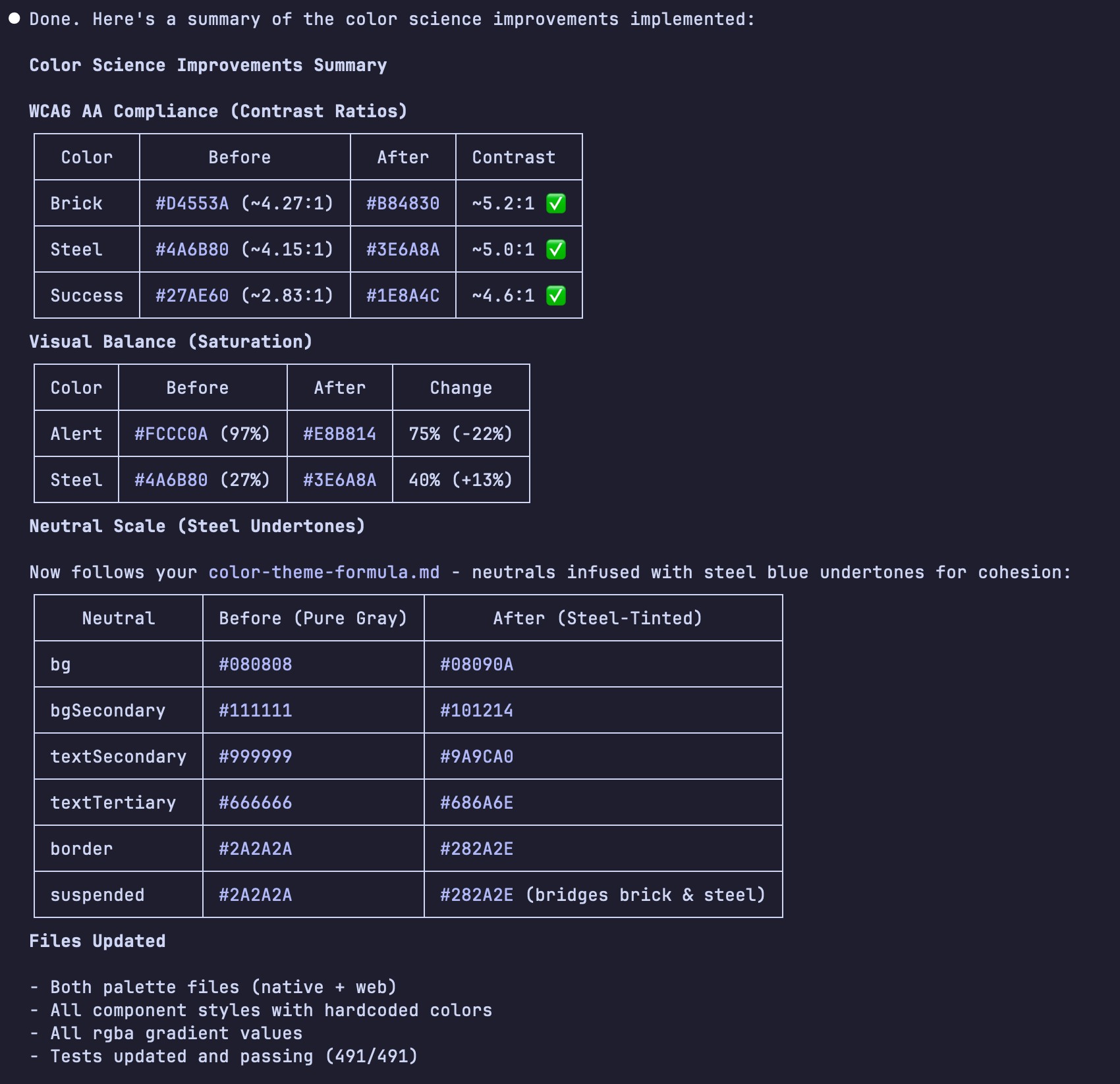Last week, I asked Claude to review the interface of one of my side projects with the principles of "color science" and give me guidance. I don't know what color science is but I'd seen it mentioned a few times on my various timelines. The results felt better from a visibility, contrast and legibility standpoint in ways I couldn't have articulated, let alone fixed myself. I'm working outside of my comfort zone but I needed it to be better.